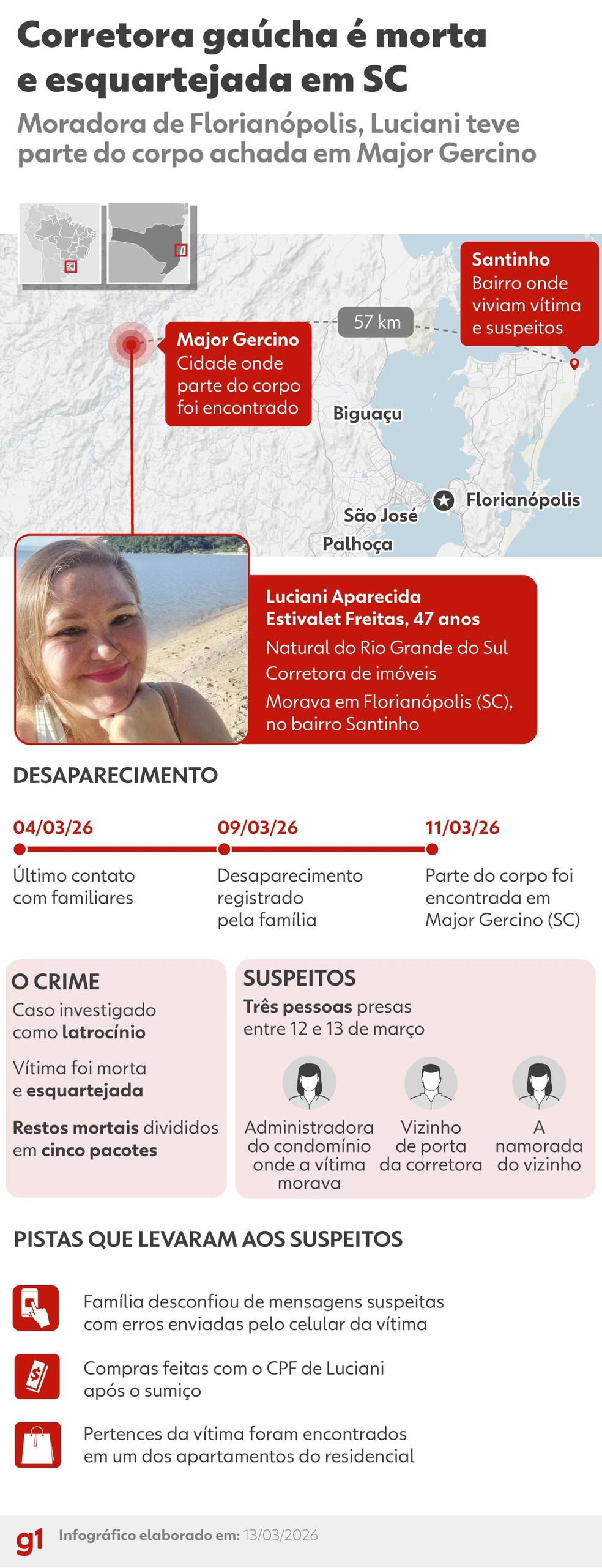 Um exame de DNA comprovou que o corpo encontrado no início de março em Major Gercino, na Grande Florianópolis, é da corretora de imóveis gaúcha Luciani Aparecida Estivalet Freitas, de 47 anos, morta na capital. A conclusão aconteceu após mais de um mês do corpo ter sido encontrado.